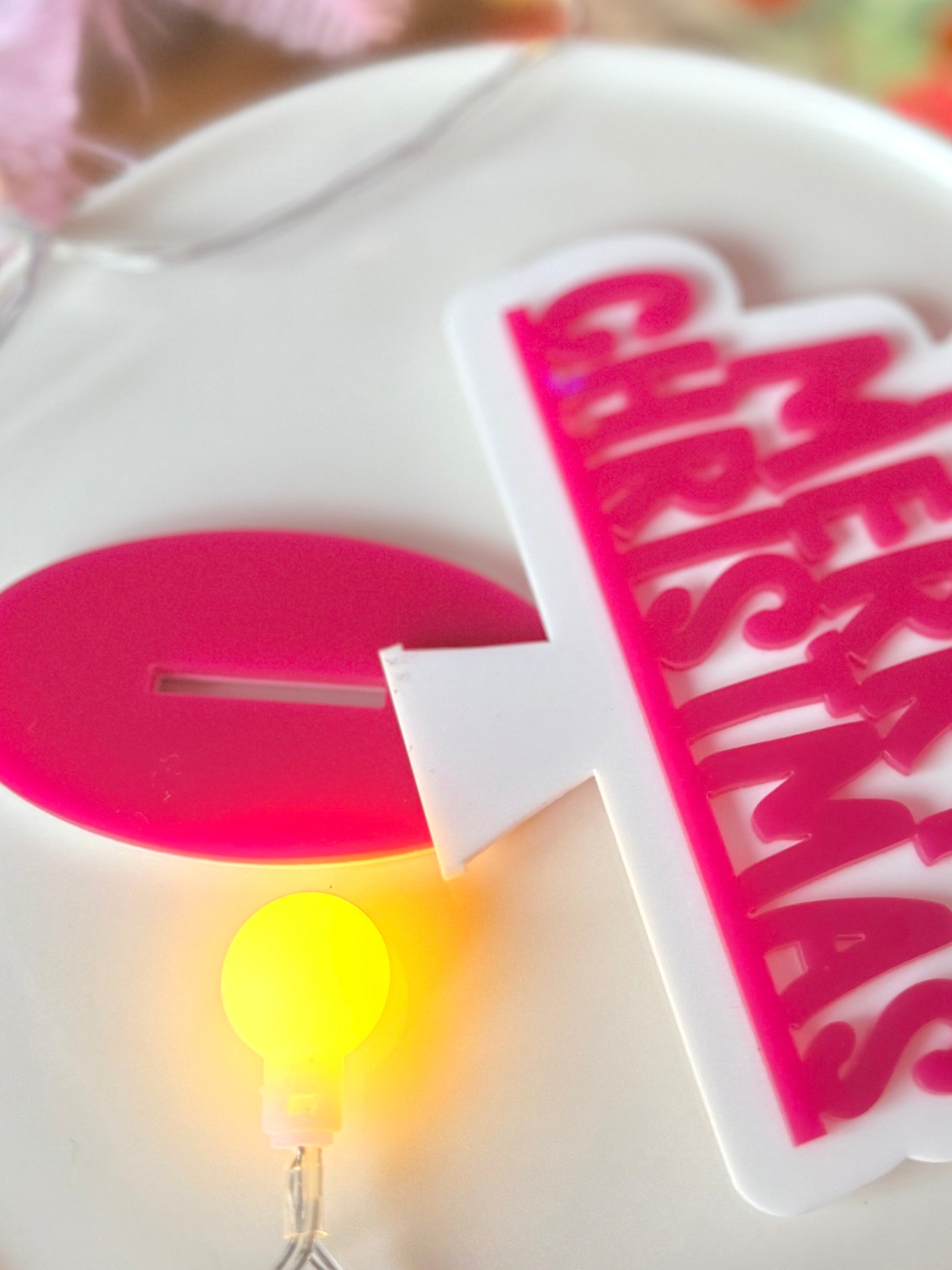 Laser cut from 3mm cast acrylic, available in two colourways, red and pink both on a white background with matching base.