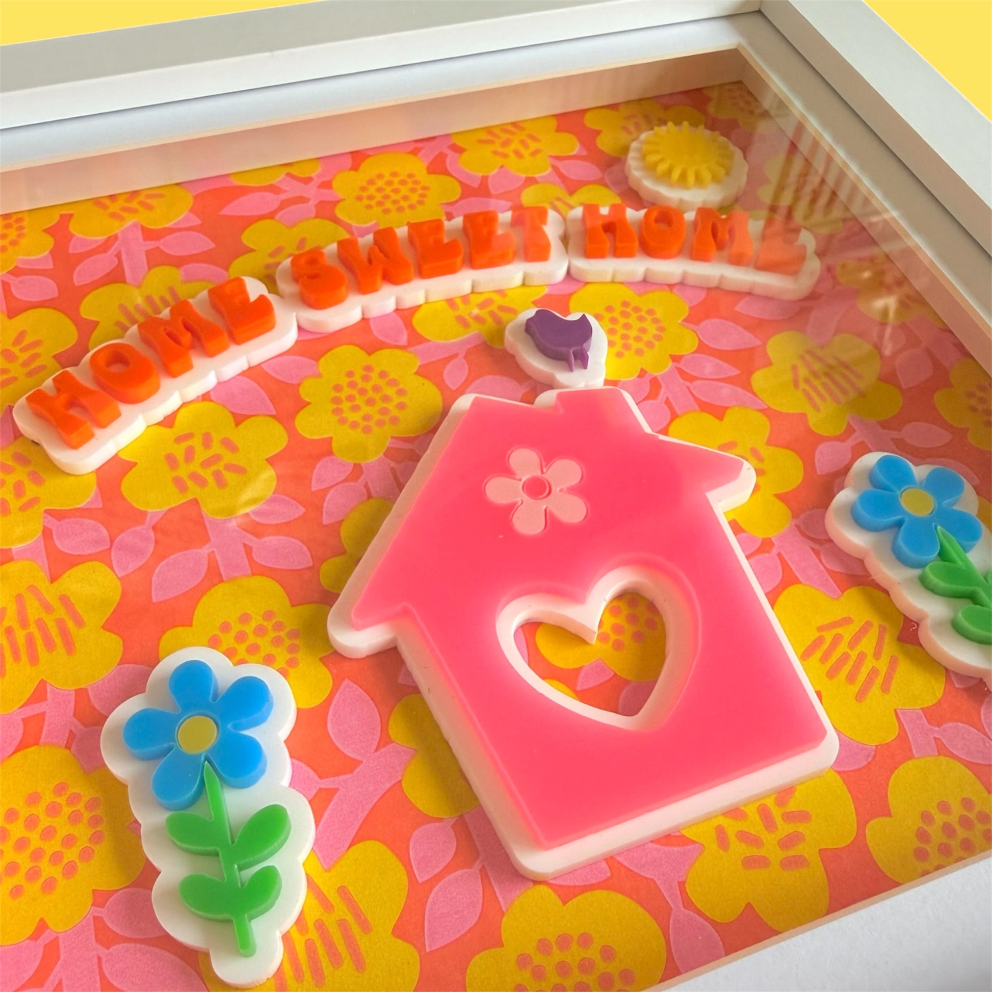 A lovely Home Sweet Home picture, handmade from 3mm cast acrylic and framed in a white box frame ready to hang on the wall.