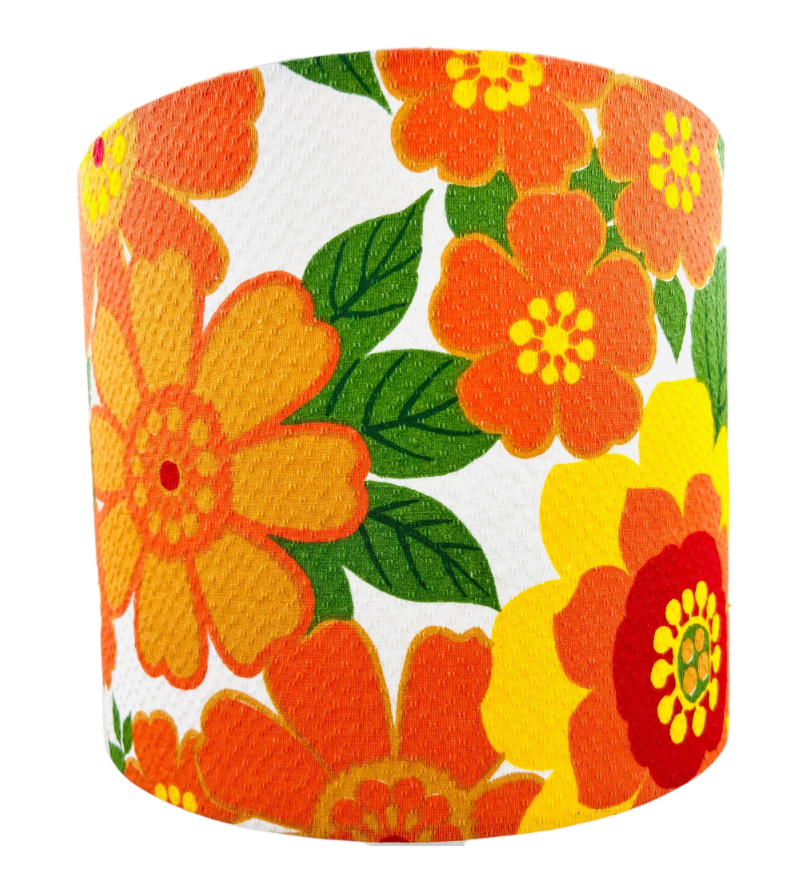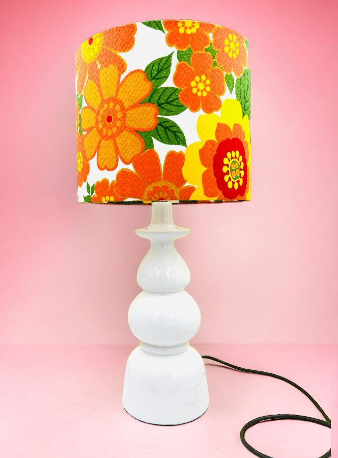 A gorgeous white vintage table lamp matched with a lampshade handmade from a piece of retro flower fabric, the colours of orange, yellow, green and red on a white background are so vibrant.