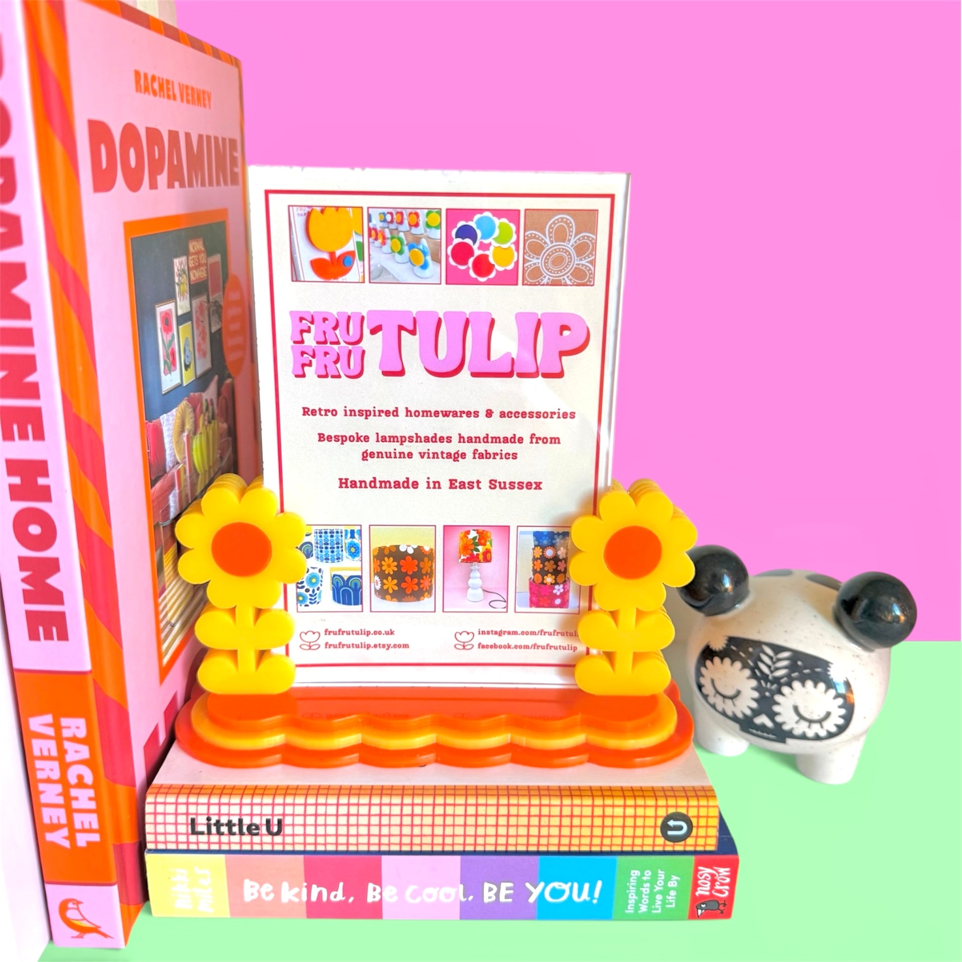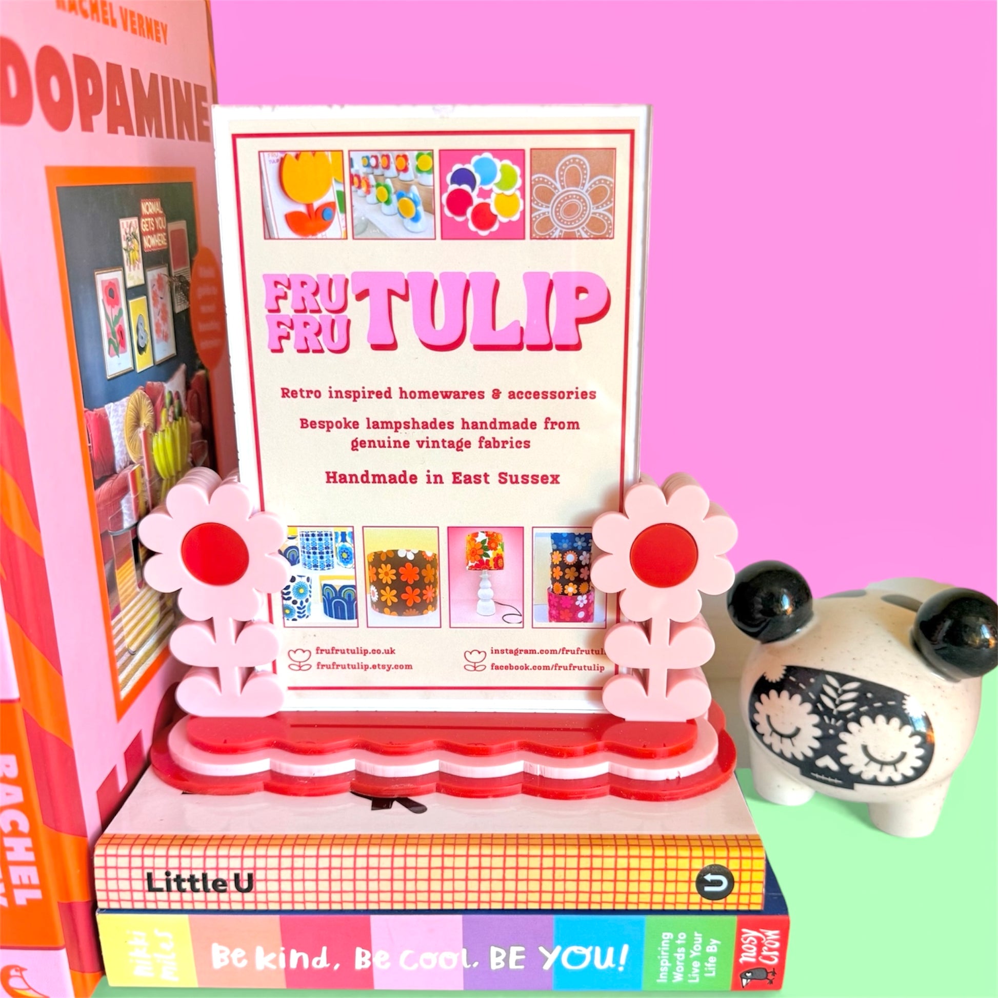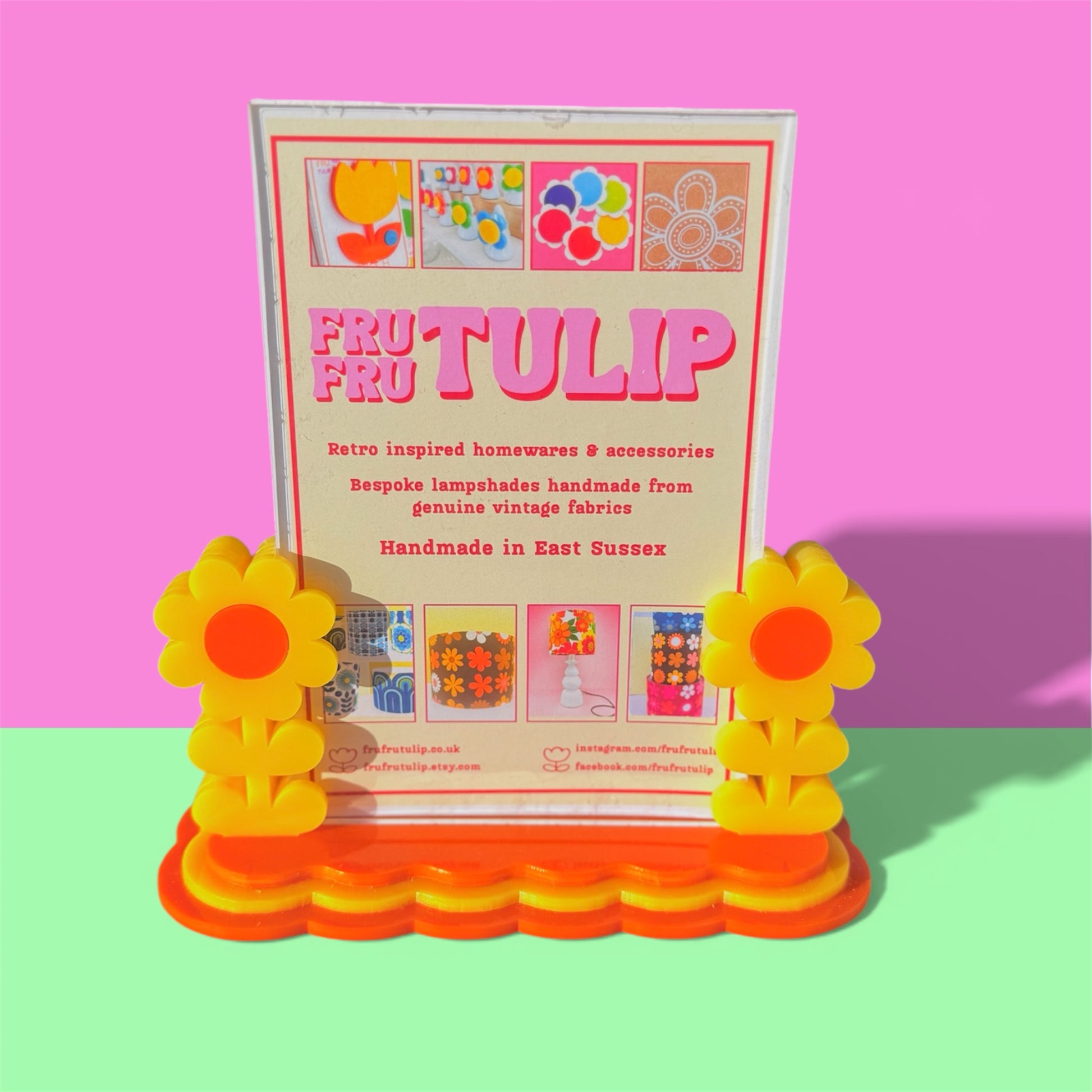 A Fru Fru Tulip design, handmade from vibrant, 3mm cast acrylic including the photo display (no glass) the acrylic photo insert just slots in between the two flowers. The Fru Fru Tulip logo is engraved on the bottom of the base.