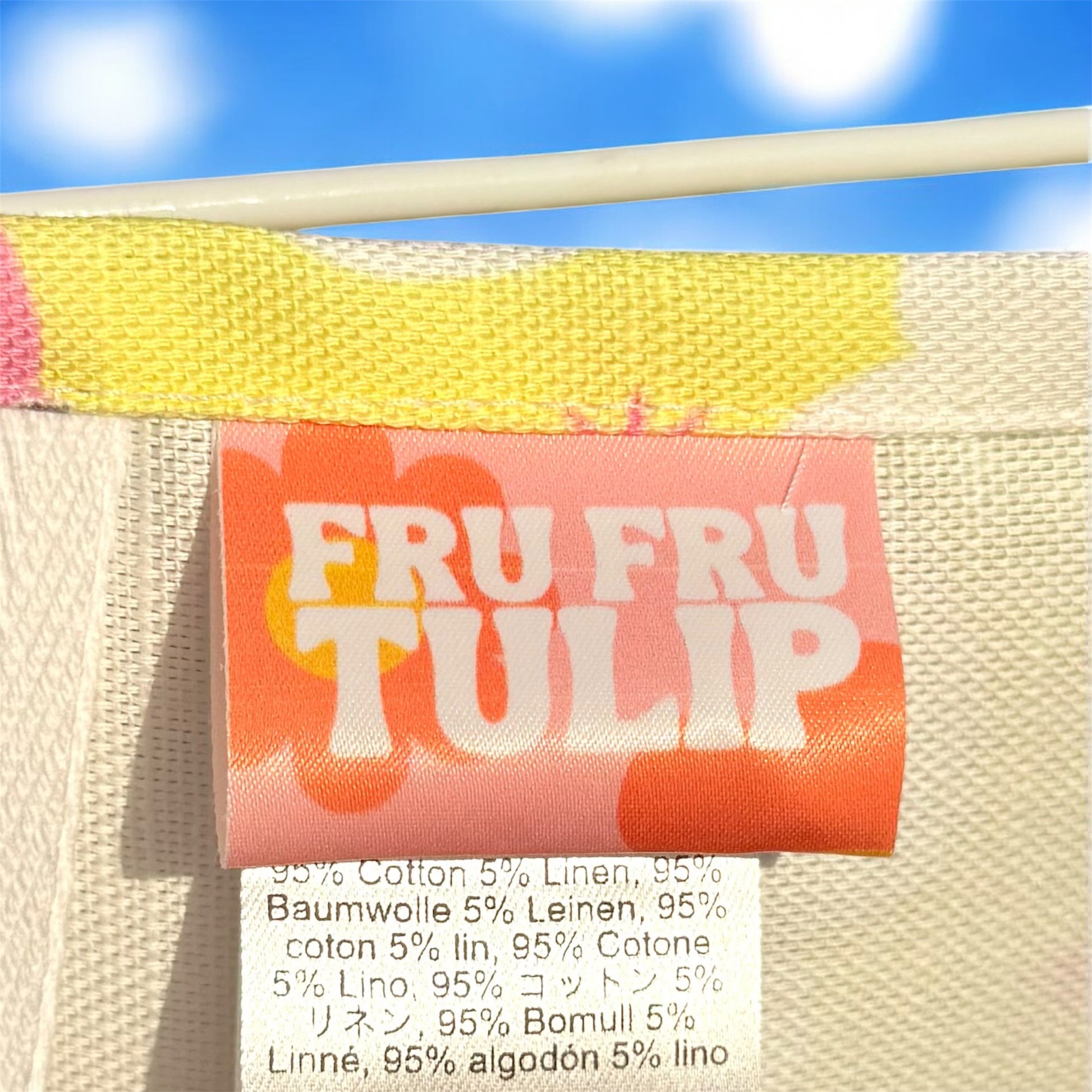 A fabulously gorgeous large, retro flower tea towel, colours of yellow, pink, white and a touch of red, printed into 95% cotton and 5% linen fabric.