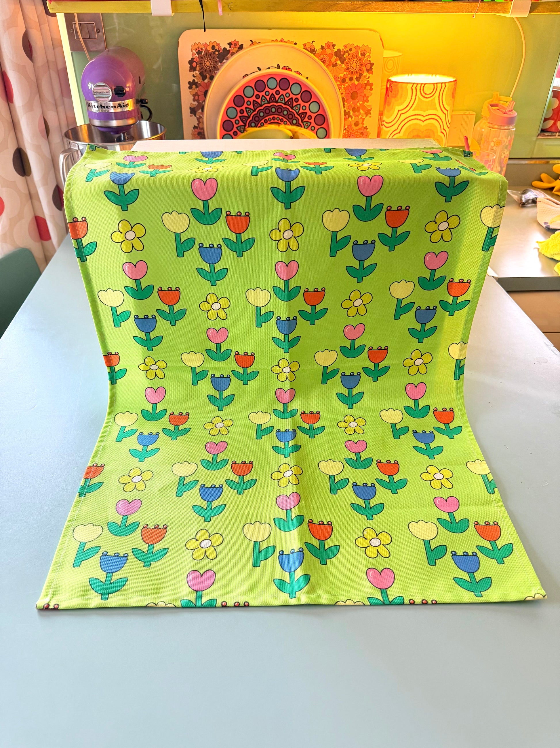 A fabulously gorgeous large, retro flower tea towel, colours of yellow, pink, blue and red printed onto 100% cotton fabric.