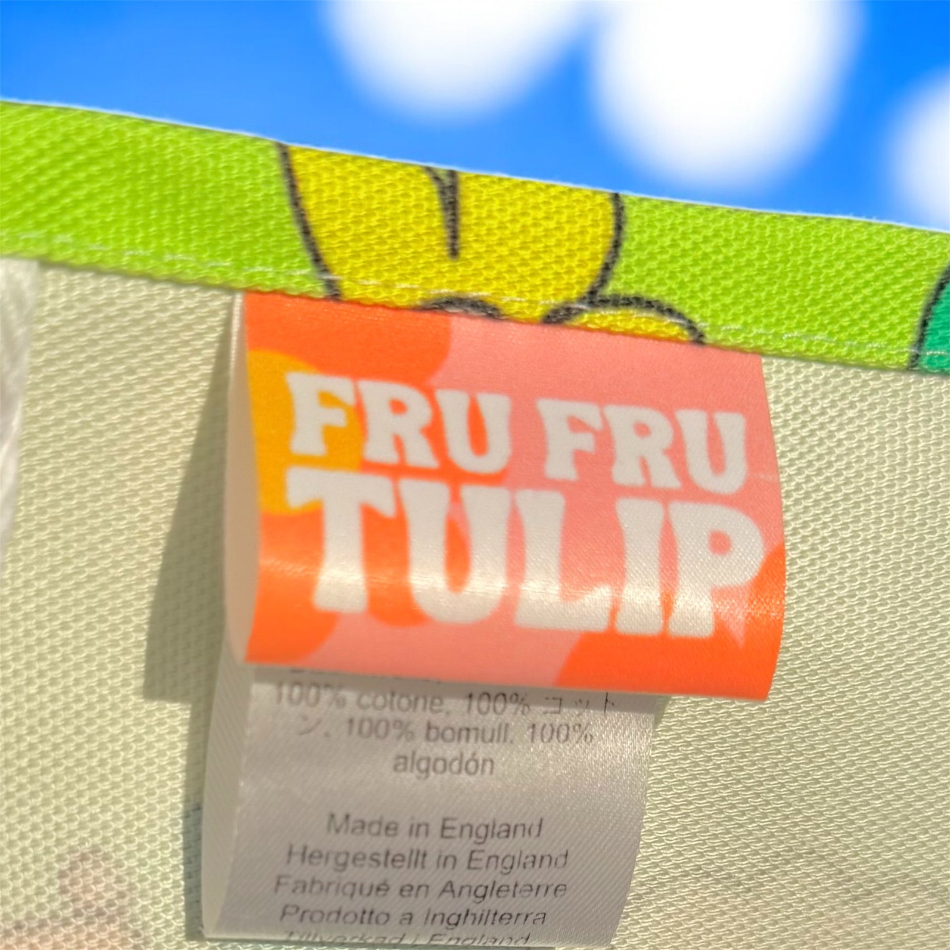A loop on one corner so it can be hung/displayed and a Fru Fru Tulip label.